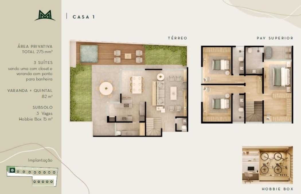 Registre-se abaixo para garantir este benefícioMirador da Mata: cadas de design cercadas por mata nativa preservada Situado entre Santa Felicidade e o Vista Alegre, o Mirador da Mata se encontra próximo a dois Parques (Barigui/Tingui) e possui rápido acesso ao centro pela Av. Manoel Ribas. A apenas 10 min da Praça 29 de Março, ou a 11 min do Centro Cívico. Condomínio fechado de townhouses Condomínio rodeado por bosques de preservação permanente Projeto diferenciado em Townhouses - construtora especializada Arquitetura contemporânea Casa 1: 277,55m² privativos 3 suítes (master com closet e varanda com ponto para banho) Varanda mais quintal com 82m² Subsolo com 3 vagas e hobbie box 15m² Casas: Somente 14 unidades - 6 opções de plantas Casas de 170m² a 277m² privativos Opções de 3 suítes ou 1 suíte + 2 demis Unidades com 2 ou 3 vagas Casas com vistas definitivas e ensolação plena Quintal no mesmo nível do térreo - integração com o estar e jantar Varanda gourmet com churrasqueira Esquadrias de alta perfomance com vidros laminados Infra para SPA no quintal privativo Infra para ar condicionado na sala e quartos Fechadura eletrônica no acesso do subsolo Pé direito livre de 2,55 m Banheira de imersão nas suites com varanda Espaço privativo no subsolo para uso individual: trabalho, firtness, lazer ou depósito Áreas comuns: Eclusa social com reconhecimento facial Central de entregas de encomendas Boulevard interno - 100% pedestres Circulação de veículos no subsolo Lounge descoberto com fireplace Salão de festas com vista para a mata Carregador para carro elétrico (1 por casa) Playground Proteção perimetral com cerca elétrica industrial Estacionamento para visitantes *Valores sujeitos à alteração sem aviso prévio, consulte a disponibilidade e valores atualizados com o corretor responsável. *O anúncio pode conter fotos em perspectiva meramente ilustrativas ou de apartamento decorado.