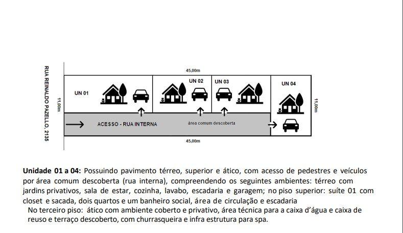 Registre-se abaixo para garantir este benefícioIMÓVEL PRONTO Sobrado 4, Localizado no bairro Santa Quitéria, possuindo pavimento térreo, superior e ático, com acesso de pedestres e veículos por área comum descoberta (rua interna), compreendendo os seguintes ambientes: Térreo com jardins privativos, sala de estar, cozinha, lavabo, escadaria e garagem; no piso superior: suíte 01 com closet, dois quartos e um banheiro social, área de circulação e escadaria; No terceiro piso: ático com ambiente coberto e privativo, área técnica para a caixa dágua e caixa de reuso e terraço descoberto, com churrasqueira e infra estrutura para spa. Piso laminado nos quartos e porcelanato nas áreas frias. Condomínio: Área comum: Rua interna em paver, com drenagem e bacia de contenção de cheias, grama natural, iluminação comum, portão metálico basculante e portão de pedestre separado. Unidades: Todas as unidades possuem revestimento em porcelanato polido retificado 1,20mX0,60m na cozinha, sala, banheiro, circulação, escada e ático. Todos os quartos são revestidos em piso laminado de alto padrão. Cozinha e banheiro possuem revestimentos nas paredes em azulejo branco. Terraço, sacadas e garagem possuem revestimento em porcelanato 90cmx90cm de alto padrão. Todas as unidades possuem rebaixamento em gesso no piso térreo e superior. Todos os banheiros são entregues com vaso sanitário, cuba e ralos. Varanda com guarda corpo metálico. Janelas e esquadrias em alumínio preto, portas com pintura PU e acabamento liso. Pintura externa de todas as unidades em revestimento projetado, com detalhes em tijolo a vista, pintura interna com acabamento branco. Toda a infraestrutura elétrica e hidráulica foi executada de acordo com o projeto para atender todas as necessidades do imóvel, com entradas e medições individuais, todas as unidades possuem infraestrutura de gás para 2 botijões de 45kg (não inclusos). Cada unidade conta com 1 vaga de garagem, sem contar o espaço da rua interna. IMPORTANTE: SOBRADO 01: VENDIDO SOBRADO 02: VENDIDO SOBADO 03: VENDIDO SOBRADO 04: 850.000,00 Consulte disponibilidade e valor com um de nossos corretores. Valores sujeitos a alteração sem aviso prévio.